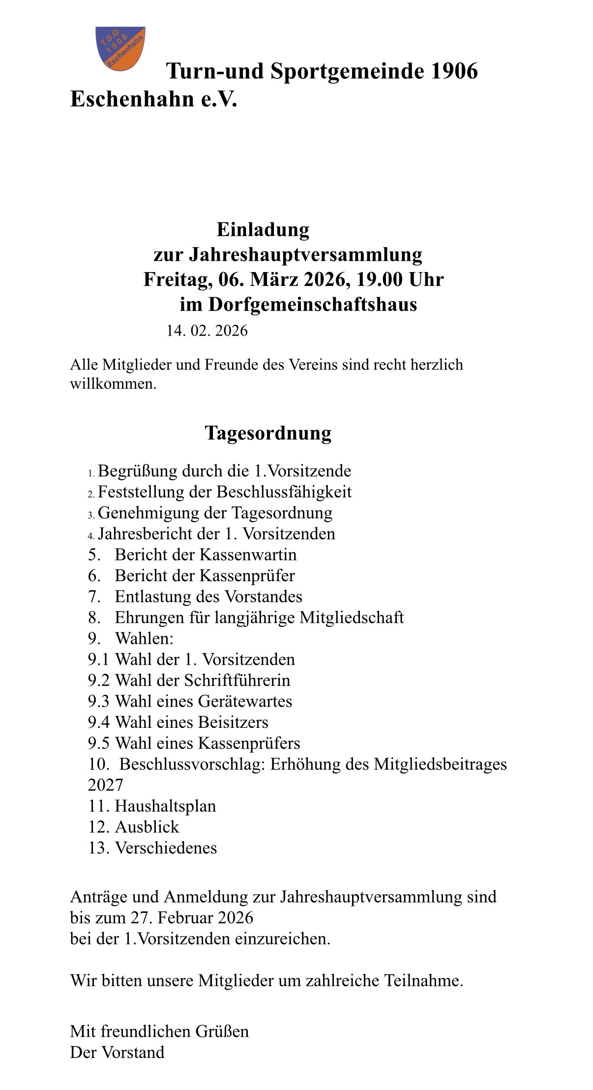 Der Verein lädt alle Mitglieder herzlich zur diesjährigen Jahreshauptversammlung ein.